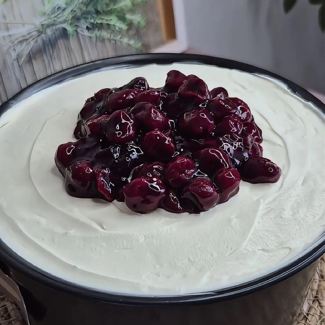 It is not just fruit spooned over the cream. The cherries are cooked lightly with sugar, then thickened so they stay in place. That means you get distinct layers instead of juice running into the cream.