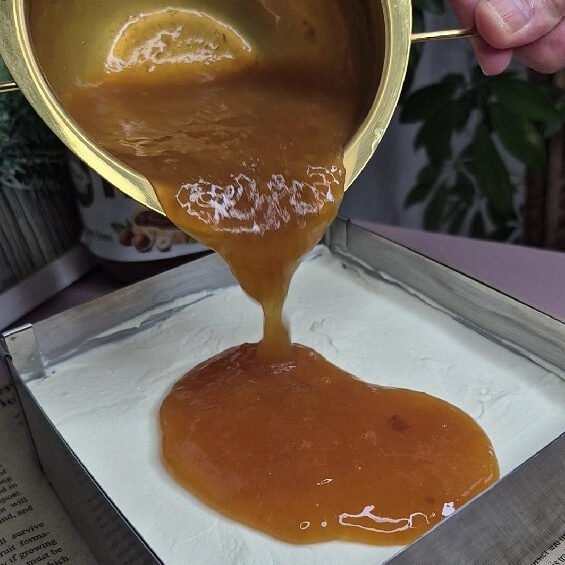 When I poured the warm apricot topping with gelatin over that silky white layer… ufff. Pure magic.