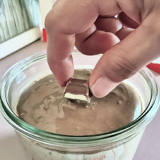 The topping couldn’t be simpler. I melted 3 more Kinder bars, taking in the glossy shine as they softened into a luxurious chocolate blanket. When it was perfectly melted and fluid, I poured it over the cream layer.
