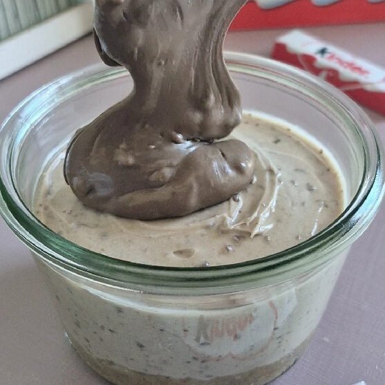 The melted Kinder topping creates a thin shell that stays soft but solid enough to give that satisfying first-spoon breakthrough.