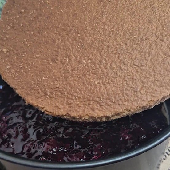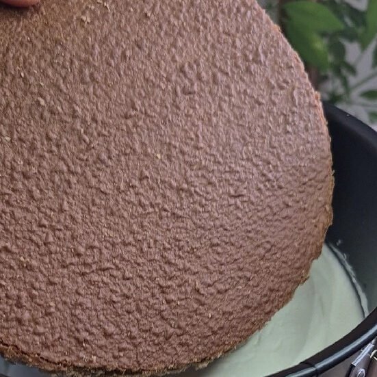 I place the first chocolate sponge layer into the pan and lightly brush it with milk to keep it soft and juicy.