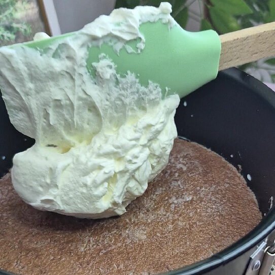 - Place the first cake layer on a serving plate or in the pan. Lightly brush it with a little milk, then spread with a layer of mascarpone cream.