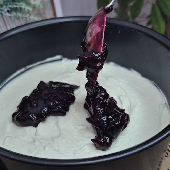 The second sponge goes on top, brushed again with milk, covered with another layer of cream, and topped with the cooled cherry filling.
