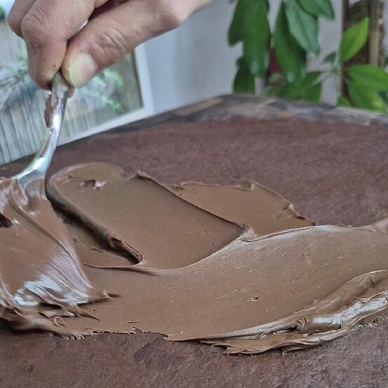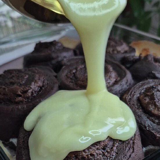 While it cools slightly, I melt 100 g white chocolate. The contrast of white chocolate over the cocoa dough makes the dessert look unbelievably elegant.