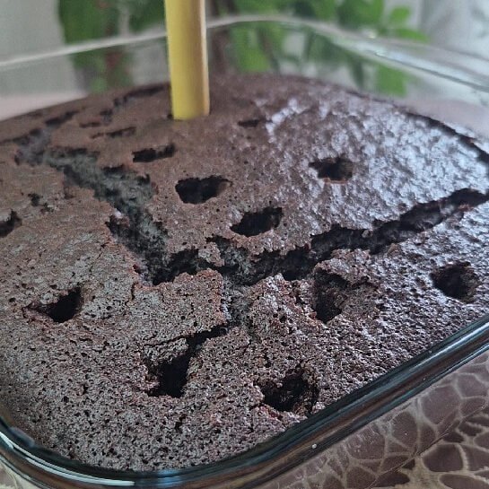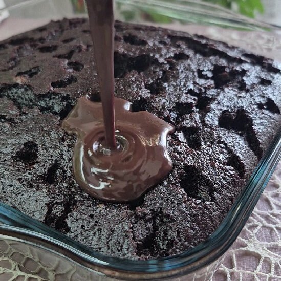 The first time I baked it, I thought I’d messed it up. After it came out of the oven, you poke holes in the top and pour a hot cocoa-milk sauce over it. The cake looks like it’s drowning. Then it rests, drinks everything in, and somehow turns into this soft, rich, spoonable cake that stays moist for days. And then there’s a quick ganache on top, because if you’re already here, you might as well commit.