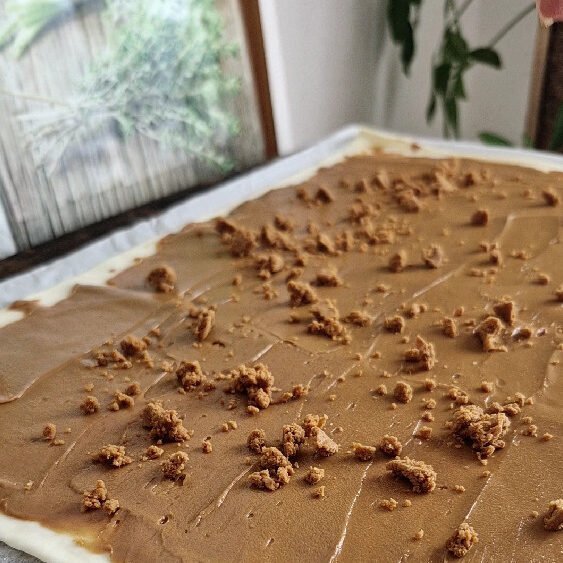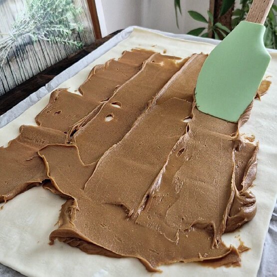 - Lay the first puff pastry sheet flat. Spread Biscoff spread evenly over it, leaving a small border.