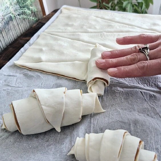 Take one triangle and start rolling from the wide end toward the point. Roll snugly, but don’t stretch the pastry too much. Tuck the tip underneath at the end so it doesn’t pop up while baking.
