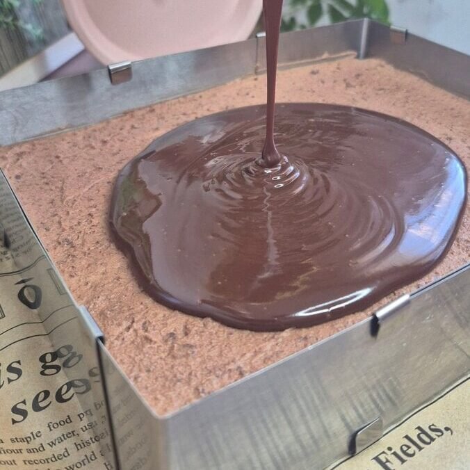 Pour the ganache over the chilled mousse and tilt the pan to spread it evenly. If needed, use a spatula lightly, but I usually just tilt.