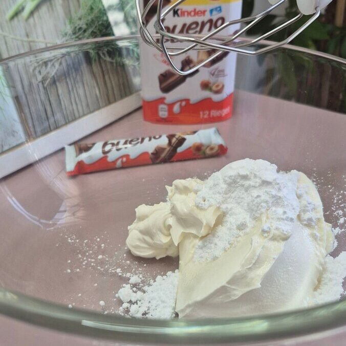 - Beat mascarpone with powdered sugar briefly until smooth. Add 250 ml heavy cream and whip until firm. Fold in chopped Kinder Bueno. Divide filling into two.
