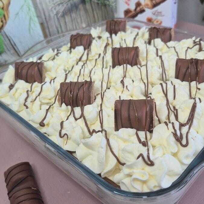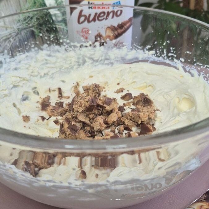 - Kinder Bueno gets folded in at the end so it stays in pieces instead of melting into the cream.