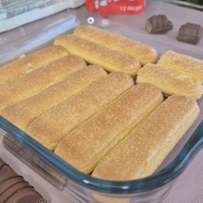 - Arrange a full layer of dipped ladyfingers in the bottom of a 20 × 20 cm pan.