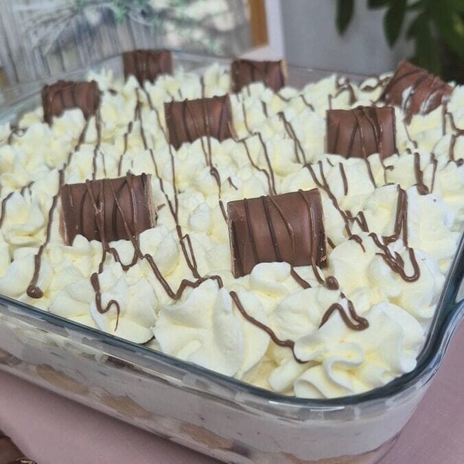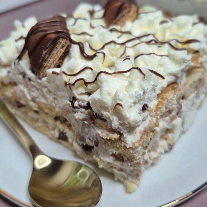 I’m calling it a cake because that’s how we serve it—cut into squares, stacked layers, creamy filling—but it’s basically a no-bake tiramisu-style dessert with Kinder Bueno folded through the cream and little pockets of Nutella in every layer. It’s sweet, yes, but the crunch from the Bueno pieces keeps it from tasting like a plain cream dessert, and the ladyfingers soften into that perfect “spoon cake” texture after a couple of hours in the fridge.