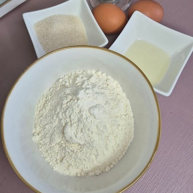 • In a bowl, whisk the eggs and sugar together. Add the milk and oil, then whisk again. Add the flour and whisk until the batter is smooth.