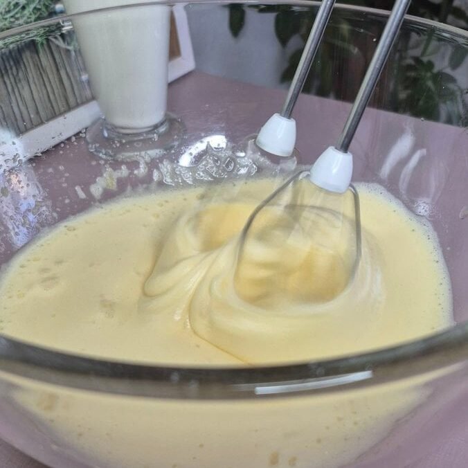 • In a bowl, whisk 2 eggs with 3 tablespoons sugar for about 30–60 seconds—just until it looks smoother.
