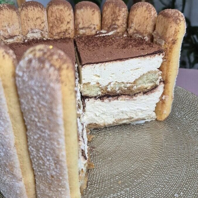 This was my first time making a Charlotte Tiramisu Cake, and I was honestly doing it a bit “let’s see if this works.” The idea is straightforward: ladyfingers on the bottom, more ladyfingers standing around the sides, then a thick coffee-and-cocoa style filling in the middle.