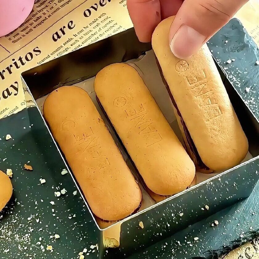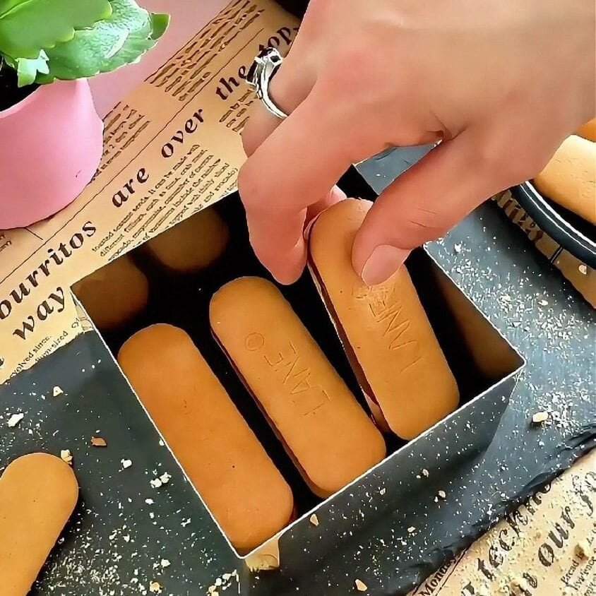 - Spread Nutella on one biscuit, top with a second biscuit, dip quickly in milk, and place in a 10×10 cm dish to form the first layer.