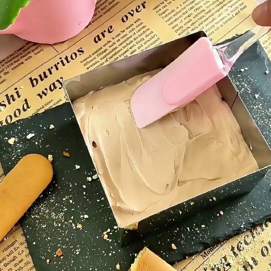 Spread the first half of the cream over the biscuit layer. Use the back of a spoon or a small spatula and push it gently into the corners.