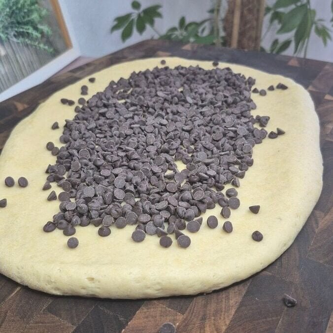 Once risen, place the dough on a board and roll it out into a rectangle. Sprinkle chocolate chips across the surface. Roll the dough up from the side into a log, then fold it over itself.