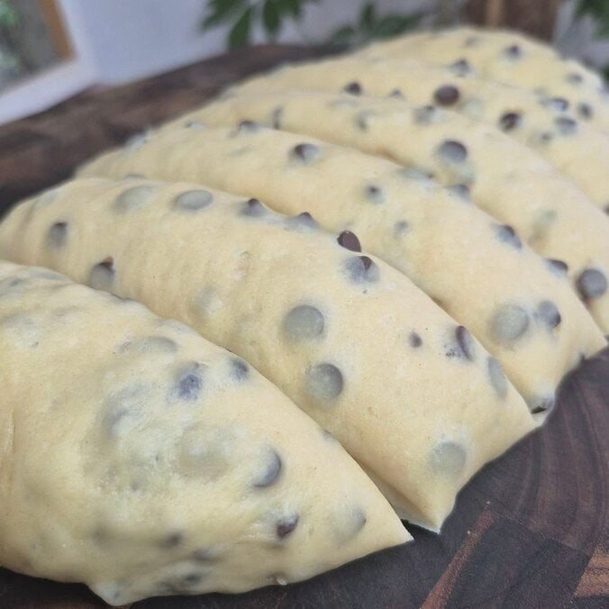 Chocolate chips are mixed in with a rolling-and-folding method rather than kneaded straight into the dough at the beginning. That’s on purpose: it keeps chips from tearing the dough too much while kneading and spreads them in thin layers so every piece has chocolate.