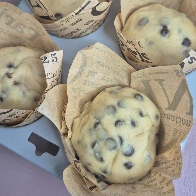 These muffins sit somewhere between a classic muffin and a small, chocolate-studded sweet bun. They rise with yeast, so the crumb comes out light and stretchy rather than cake-like, and the “roll–fold” step spreads the chocolate chips through the dough so you get little pockets in every bite instead of one heavy layer sinking to the bottom.