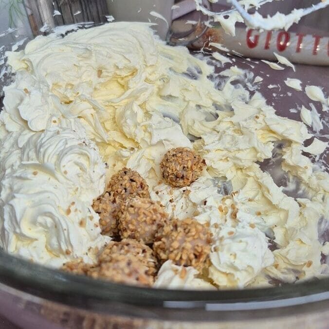 - Roughly chop/crush 10 Giotto balls and add them to the bowl. Add the cold whipping cream. Whip until thick and firm.
