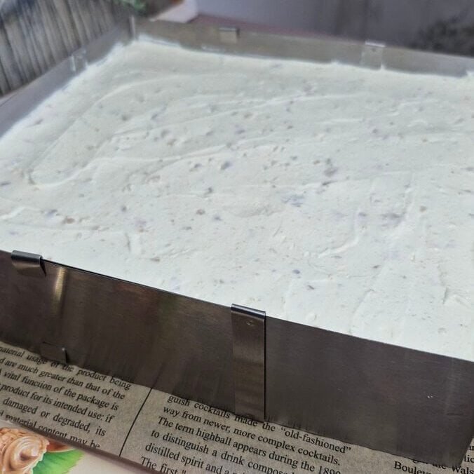 - Pour the chocolate topping over the chilled filling and spread gently if needed.