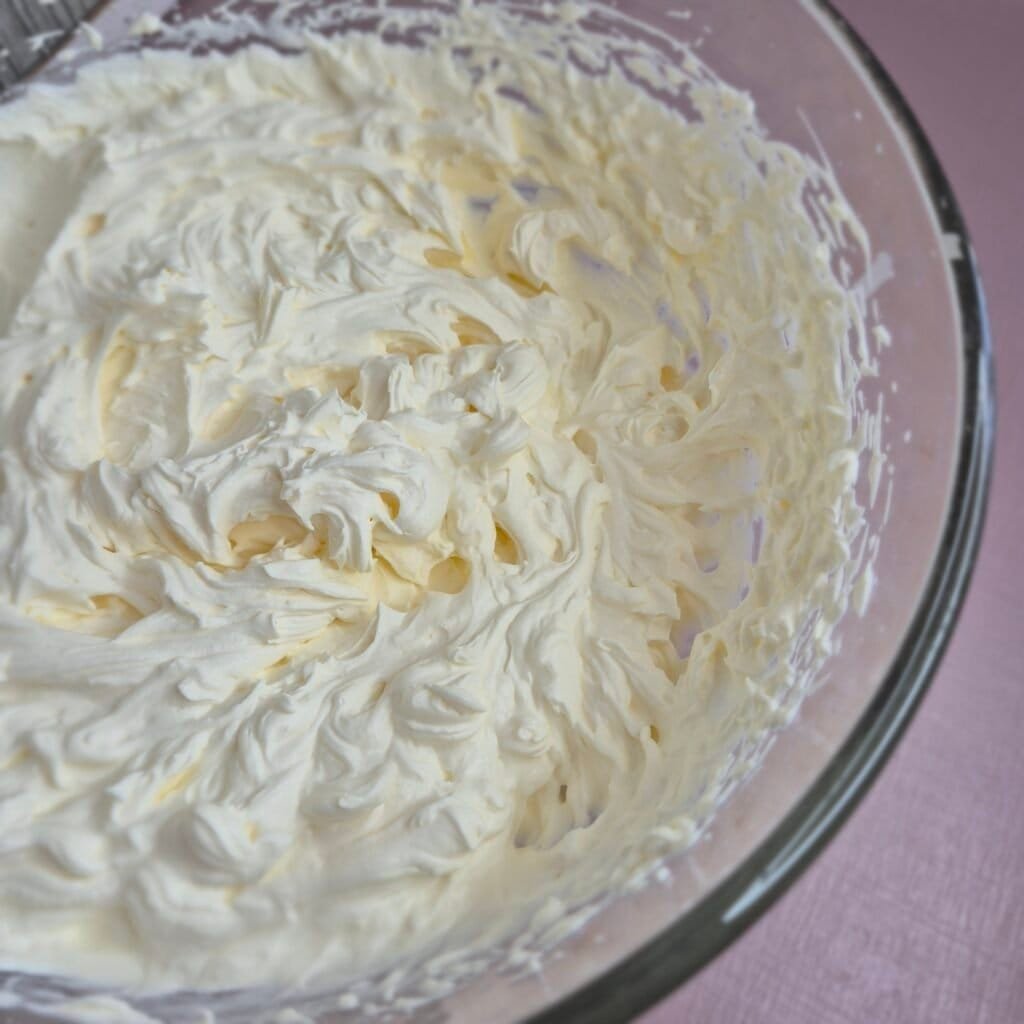 Then I add the cold heavy cream and beat until the mixture turns thick and spreadable. I keep an eye on it the whole time, because mascarpone filling can go from perfect to overmixed quite fast.