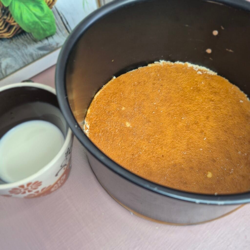 - Soak the cooled cake base with 50 ml milk.