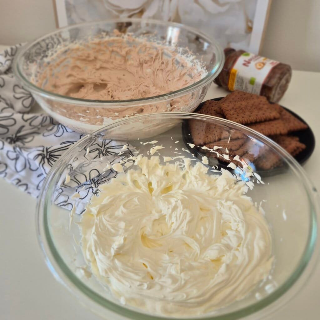 If the whole filling were mixed with chocolate spread, the dessert would feel heavier and flatter in taste. Leaving one layer plain makes the second layer stand out more.