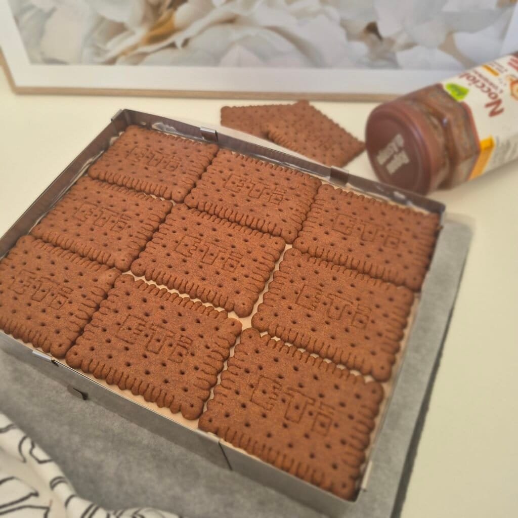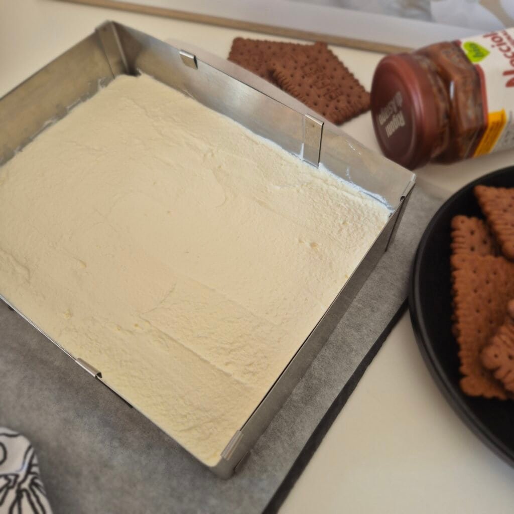 - Spread the chocolate-hazelnut filling evenly over the second biscuit layer.