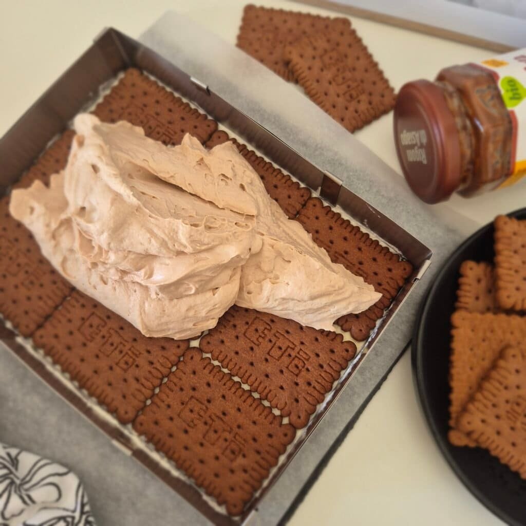 That is enough, because the biscuits, spread, and ganache already bring sweetness. This cake is better when the cream is only lightly sweetened.