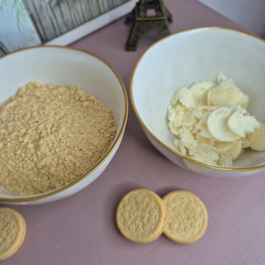 Then separate the rest. Remove the cream filling and keep it for the cheesecake mixture. Crush the cookie parts into fine crumbs. Try not to leave large chunks in the base, because a finer crumb presses better and gives cleaner slices.