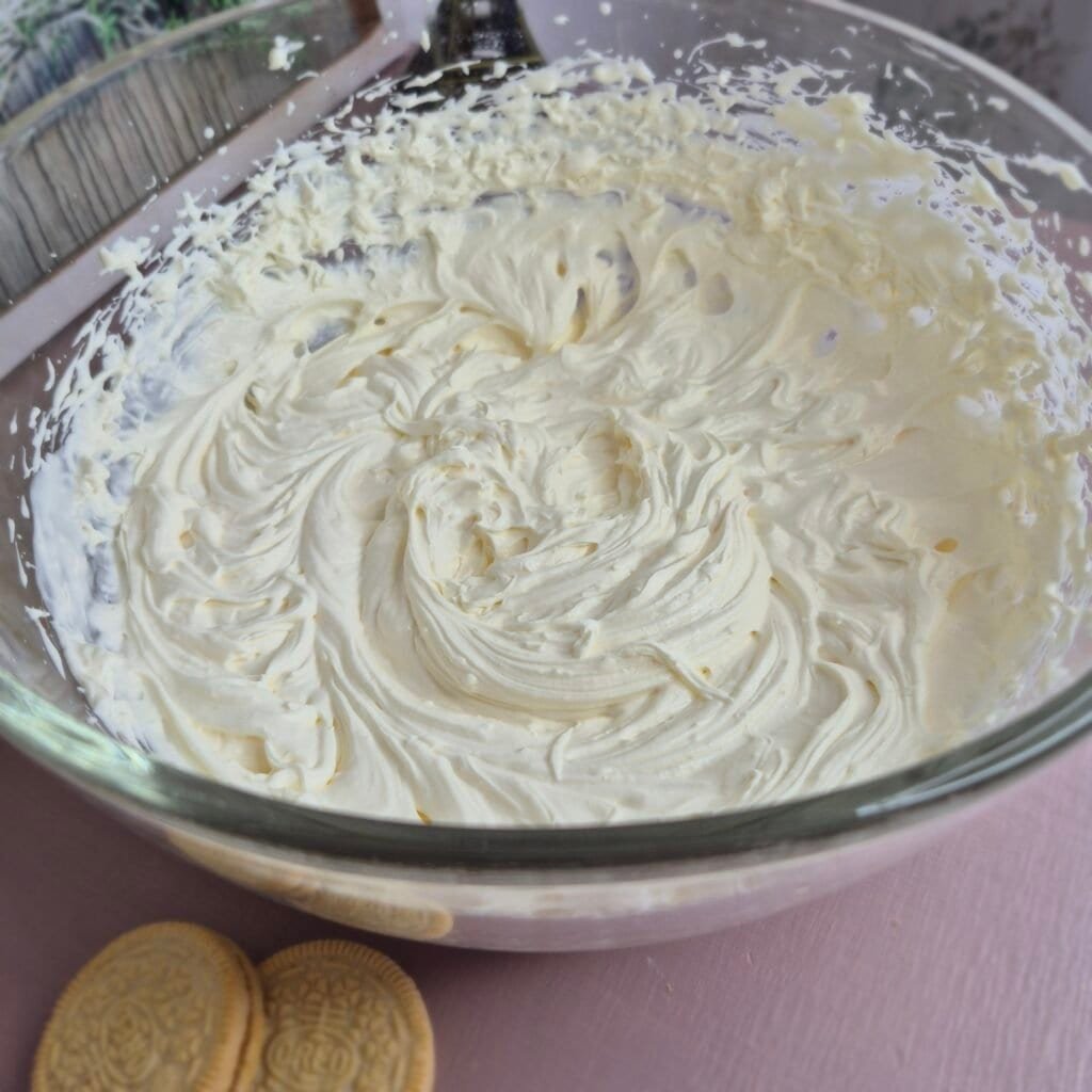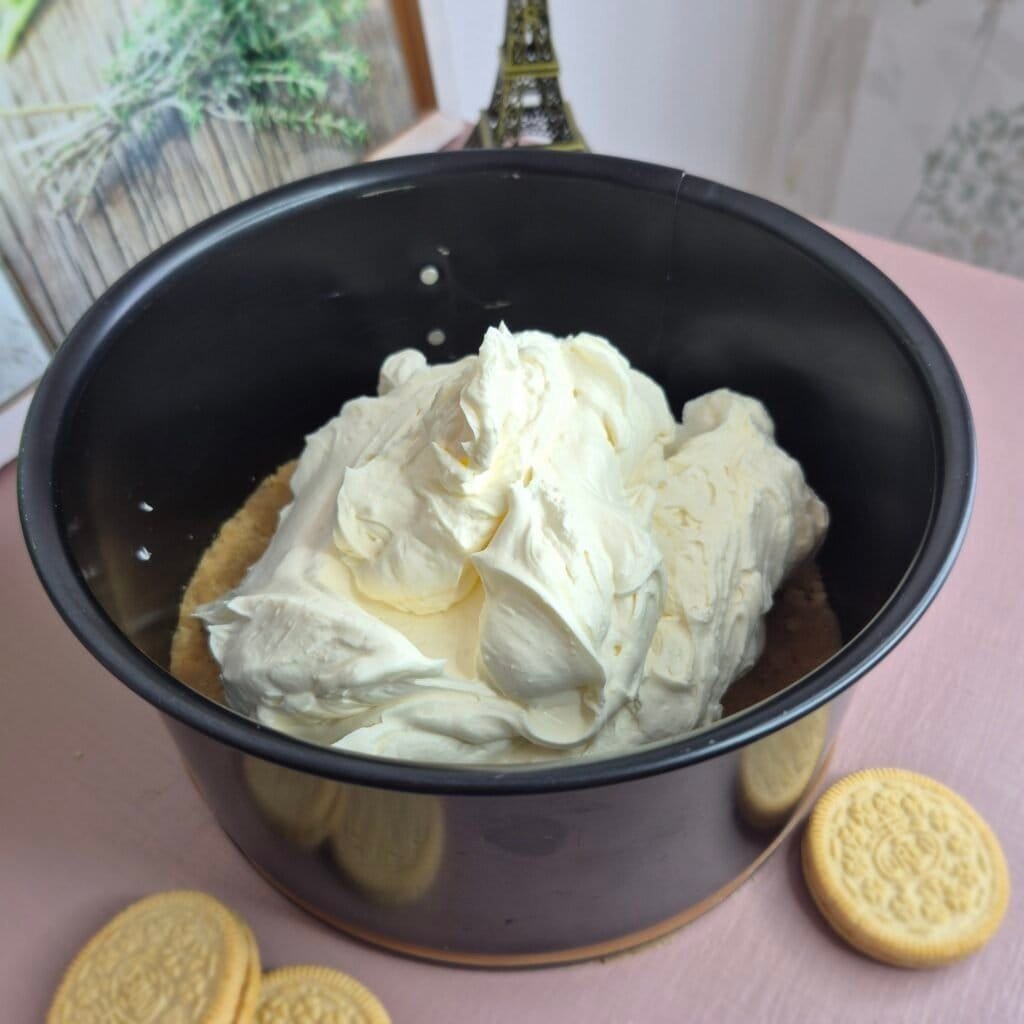 The base is made from crushed Golden Oreos, butter, and a little milk, so it sets well in the fridge and has a soft vanilla cookie flavor. The filling is smooth and thick from the mascarpone and cream, and using the cookie filling in it gives the whole cake a stronger Golden Oreo taste without needing anything extra. On top, there’s a little white chocolate and a simple mascarpone cream decoration, which finishes it off without making it too heavy.
