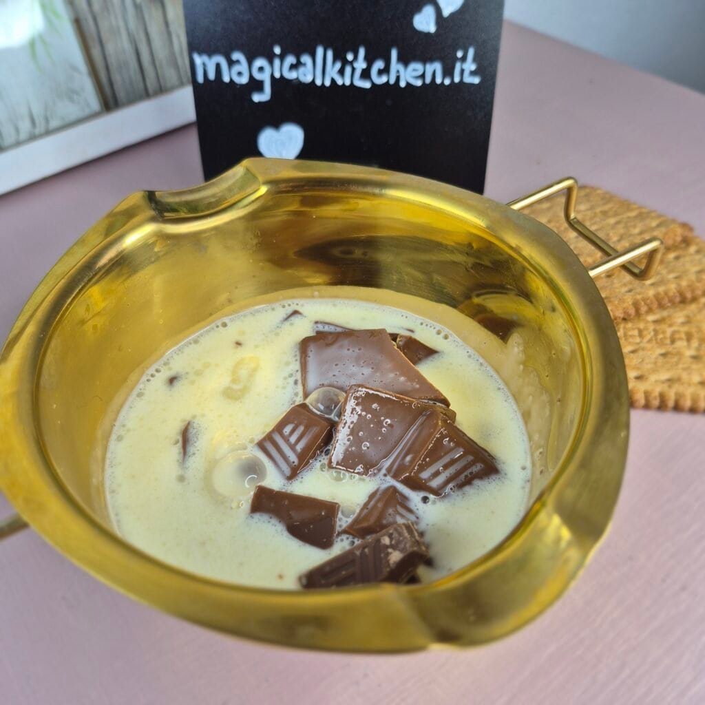 - Pour the hot cream over the broken chocolate and let it sit briefly.